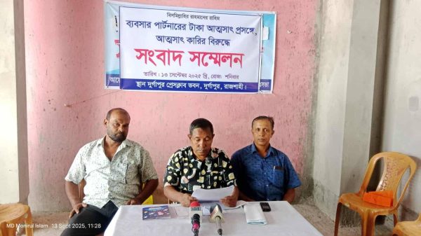 রাজশাহীর দুর্গাপুরে ব্যবসায়ার টাকা আত্মসাৎ এর অভিযোগ তুলে ব্যবসায়ীক পার্টনারের বিরুদ্ধে সংবাদ সম্মেলন অনুষ্ঠিত হয়েছে।