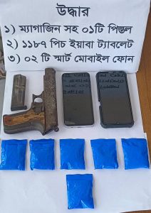 অভিযানে কুখ্যাত সন্ত্রাসী হীরা (৩৫), পিত আবু শেখ, সাং-তেলিগাতি, থানা-মোড়েলগঞ্জ, জেলা-বাগেরহাট, এ/পি সাং-মাথাভাঙ্গা, থানা-লবণচরা, খুলনাকে গ্রেফতার করা হ গ্রেফতারকৃত আসামীর হেফাজত হতে ১টি বিদেশী পিস্তল, ১টি ম্যাগাজিন, ১১৮৭ পিস ইয়াবা এবং ২টি মোবাইল ফোন উদ্ধার ক হয়েছে।