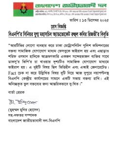 বিএনপি’র সিনিয়র যুগ্ম মহাসচিব অ্যাডভোকেট রুহুল কবির রিজভী’র বিবৃতি —