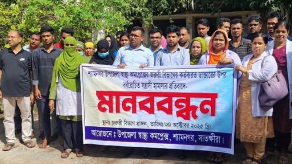 খুলনা এডিশন:: সাতক্ষীরার শ্যামনগর উপজেলা স্বাস্থ্য কমপ্লেক্সের জরুরি বিভাগের চিকিৎসকের ওপর হামলার প্রতিবাদে মানববন্ধন করেছেন চিকিৎসক ও স্বাস্থ্যকর্মীরা। বৃহস্পতিবার (৩০ অক্টোবর) দুপুরে উপজেলা স্বাস্থ্য কমপ্লেক্সের ভবনের সামনে এই মানববন্ধন