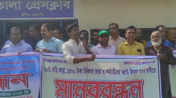 খুলনা এডিশন:: সাতক্ষীরার তালায় “ভিক্ষা নয় অধিকার চাই”, “শিক্ষকদের নায্য দাবি, মানতে হবে মেনে নাও”!”২০% বাড়ি ভাড়া, ১৫০০ টাকা চিকিৎসা ভাতা ও ৭৫% উৎসব ভাতা দিতে হবে দিয়ে দাও”! এই