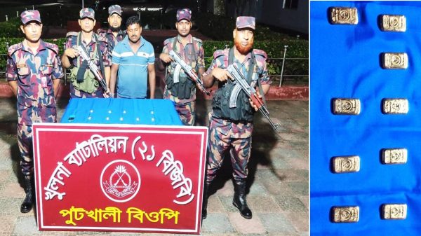 খুলনা এডিশন:: যশোরের বেনাপোল সীমান্তে বর্ডার গার্ড বাংলাদেশ(বিজিবি)’র সদস্যরা অভিযান চালিয়ে ৯ পিস স্বর্নের বারসহ মনিরুজ্জামান (৩৭) নামে এক পাচারকারিকে আটক করেছে। বুধবার (৮ অক্টোম্বর) দুপুর ১ টার দিকে