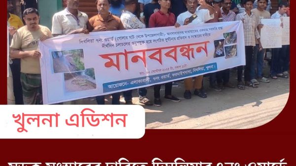 এডিশন ডেস্ক:: খুলনার দিঘলিয়া উপজেলার ৭নং ওয়ার্ডের (গোলার ঘাট থেকে উপজেলাগামী) একমাত্র প্রধান সড়কের বেহাল দশা ও চরম জনদুর্ভোগের প্রতিবাদে মঙ্গলবার (৩০ সেপ্টেম্বর, ২০২৫) সকালে ফরমাইশখানা এলাকায় এক বিশাল