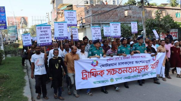 খুলনা এডিশন:: খুলনা মেট্রোপলিটন পুলিশের উদ্যোগে দুর্ঘটনা রোধ ও যানজট নিরসনের লক্ষ্যে মোটরযান চালকদের অংশগ্রহণে ট্রাফিক সচেতনতামূলক এক বর্ণাঢ্য র্যালি অনুষ্ঠিত হয়। বুধবার নগরীর শিববাড়ি মোড়ে অনুষ্ঠিত র্যালিতে প্রধান অতিথি