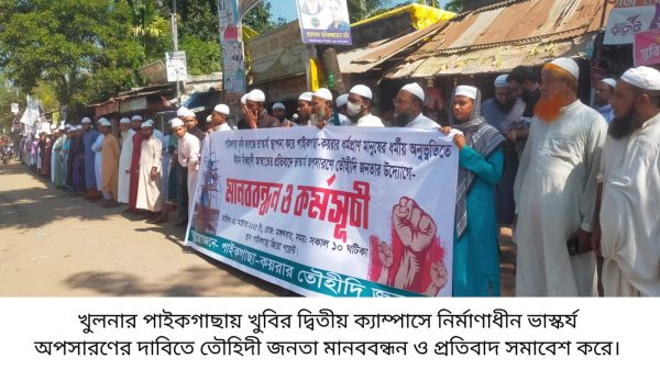 খুলনা এডিশন:: খুলনার পাইকগাছায় খুলনা বিশ্ববিদ্যালয়ের দ্বিতীয় ক্যাম্পাসে নির্মাণাধীন ভাস্কর্য ৭২ ঘন্টার মধ্যে অপসারণের জন্য আল্টিমেটাম দিয়েছে তৌহিদী জনতা। ২১ অক্টোবর মঙ্গলবার সকালে মানববন্ধন ও প্রতিবাদ সমাবেশে সরকার কে ৭২