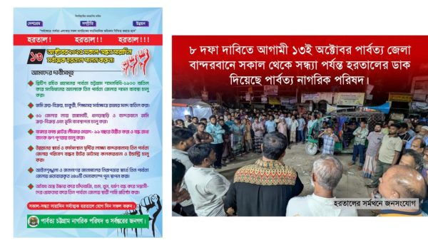 খুলনা এডিশন:: ৮ দফা দাবিতে আগামী ১৩ অক্টোবর ২০২৫ (সোমবার) পার্বত্য জেলা বান্দরবানে সকাল থেকে সন্ধ্যা পর্যন্ত হরতালের আহ্বান জানিয়েছে পার্বত্য নাগরিক পরিষদ। সংগঠনের নেতৃবৃন্দ জানিয়েছেন, পার্বত্য অঞ্চলের
