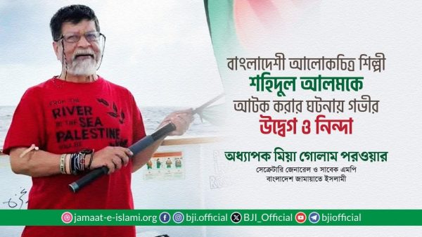 খুলনা এডিশন:: বাংলাদেশী আলোকচিত্র শিল্পী ও লেখক শহিদুল আলমকে ইসরাইলি বাহিনীর আটক করার ঘটনায় উদ্বেগ প্রকাশ করে ও নিন্দা জানিয়ে বাংলাদেশ জামায়াতে ইসলামী’র সেক্রেটারি জেনারেল সাবেক এমপি অধ্যাপক মিয়া