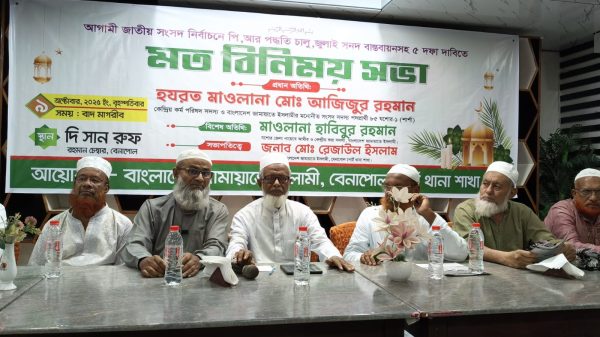 এডিশন ডেস্কঃ বাংলাদেশ জামায়াতে ইসলামী বেনাপোল পোর্ট থানার উদ্যোগে আসন্ন জাতীয় সংসদ নির্বাচনে ৫ দফা দাবি আদায়ের জন্য এলাকার গণ্যমান্য ব্যক্তিবর্গদের নিয়ে এক মতবিনিময় সভা অনুষ্ঠিত হয়। স্থানীয় এক মিলনায়তনে