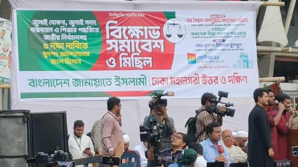 এডিশন ডেস্কঃ জুলাই ঘোষণা, জুলাই সনদ বাস্তবায়ন এবং পিআর (প্রোপোরশনাল রিপ্রেজেন্টেশন) পদ্ধতিতে জাতীয় নির্বাচনসহ পাঁচ দফা দাবিতে বাংলাদেশ জামায়াতে ইসলামীর বিক্ষোভ সমাবেশ শুরু হয়েছে। বৃহস্পতিবার (১৮ সেপ্টেম্বর) বায়তুল মোকাররম মসজিদের