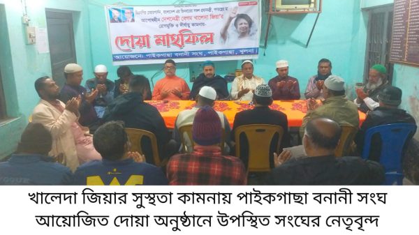 খুলনা এডিশন:: খুলনার পাইকগাছায় বিএনপির চেয়ারপার্সন ও সাবেক প্রধানমন্ত্রী বেগম খালেদা জিয়ার সুস্থতা কামনায় দোয়া মাহফিল অনুষ্ঠিত হয়েছে। ৫ ডিসেম্বর শুক্রবার সন্ধ্যায় পাইকগাছা বনানী সংঘ এ দোয়া মাহফিল অনুষ্ঠানের আয়োজন